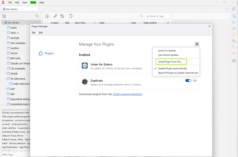 - Open Zotero and select “Plugins” from the “Tools” menu.